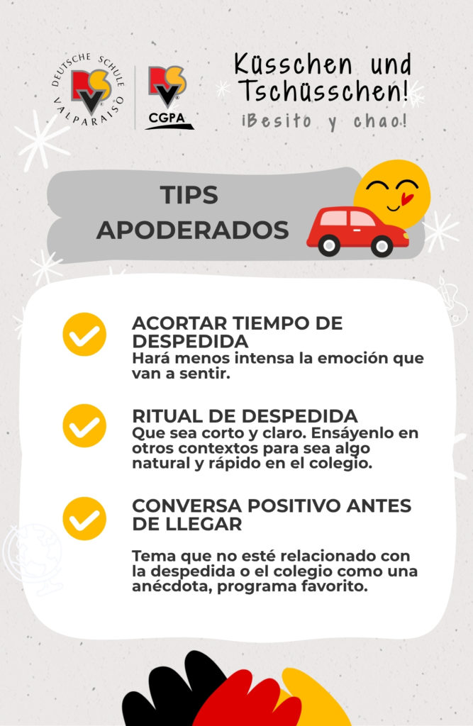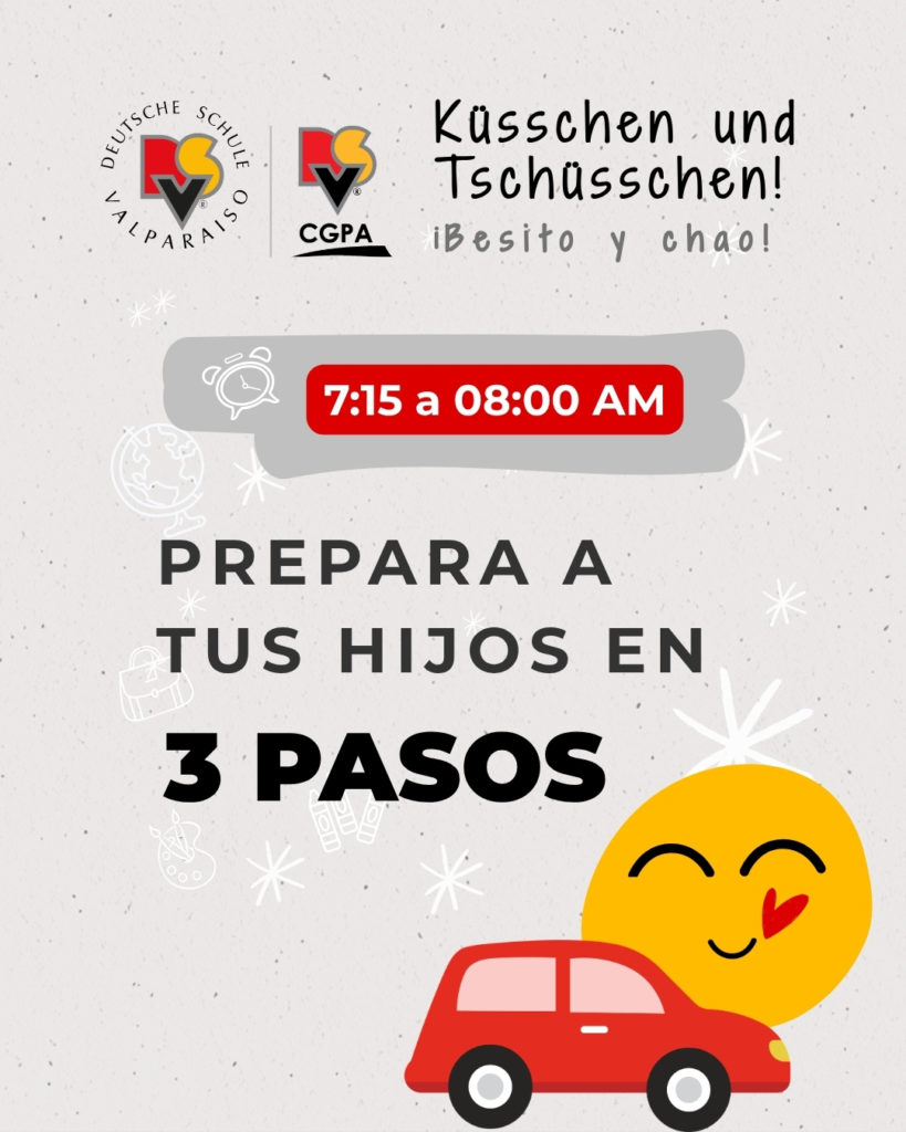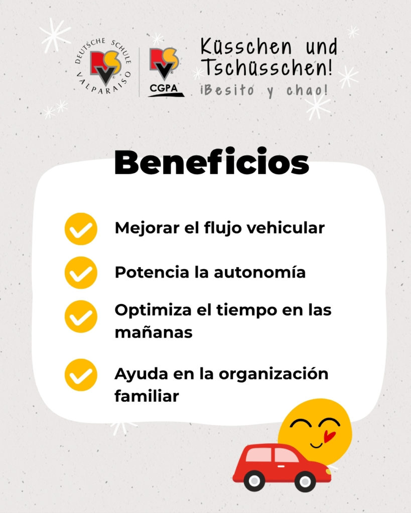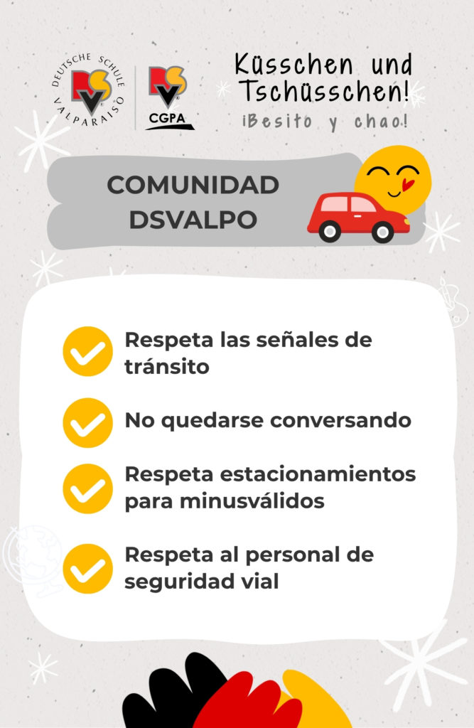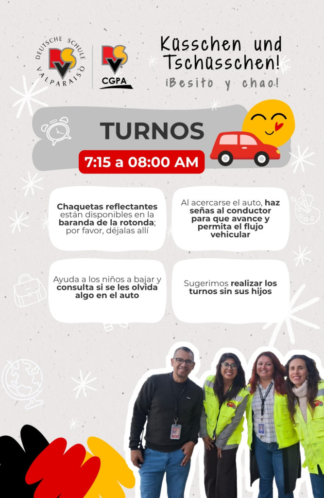Conscientes de que estamos ubicados en una zona de alto flujo vehicular, situación que se intensifica en marzo con el inicio del año escolar, el Colegio Alemán mantiene durante todo el año el programa ‘Besito y Chao’ para las familias que ingresan por el acceso de calle Álvarez (Spielgruppe, Kindergarten 1, Kindergarten 2 y 1° Básico).