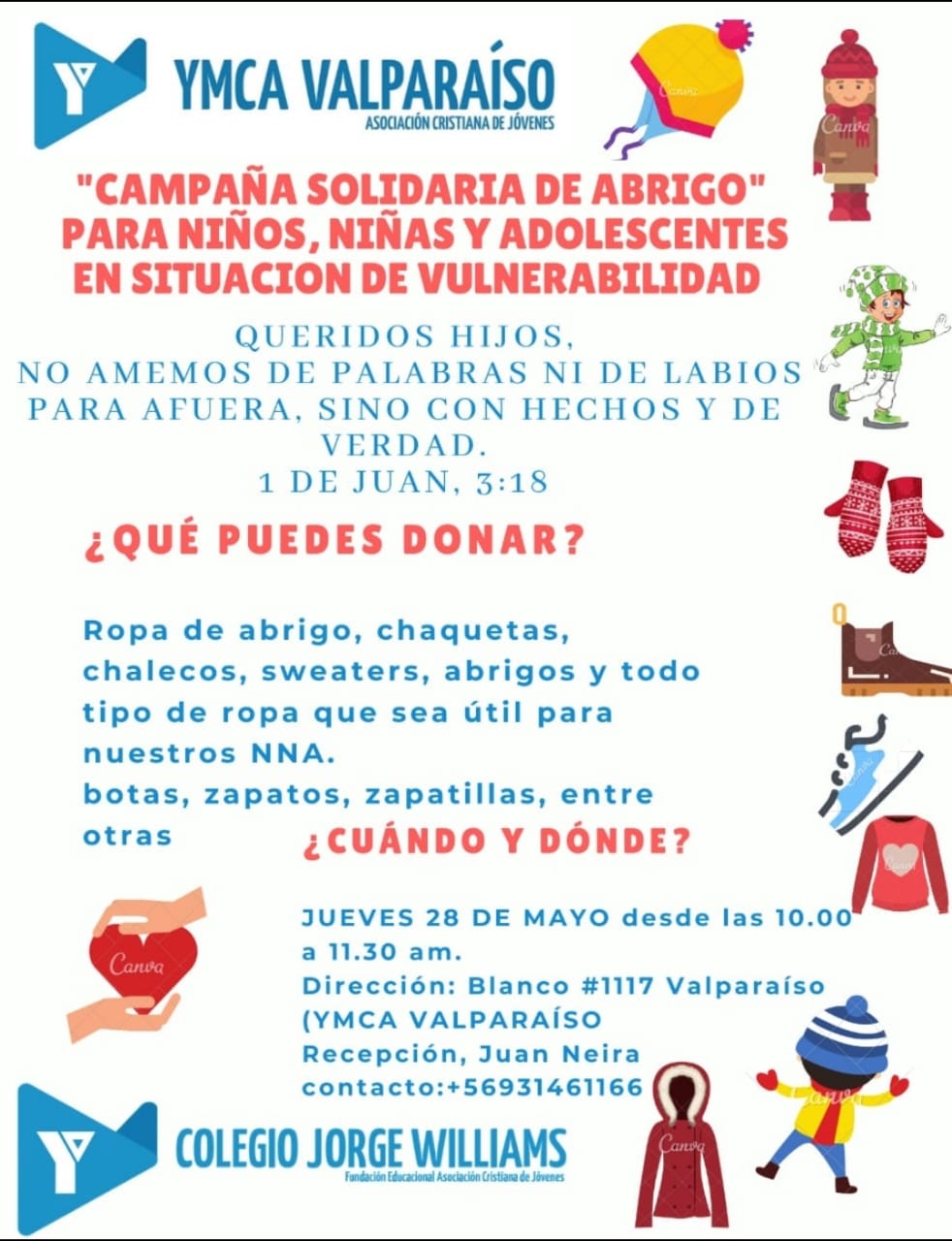 El pasado 30 de mayo, alumnos de Religión de la Enseñanza Básica y Media, acompañados por la Jefa del Departamento de Religión, Ma. Loreto Fuentes, acudieron a la sede del YMCA en Valparaíso para hacer entrega de una importante contribución de la comunidad para la campaña solidaria de abrigo para niños, niñas y adolescentes en situación de vulnerabilidad.
