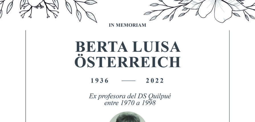 Comunicamos a la comunidad escolar el sensible fallecimiento de Berta Luisa Österreich, quien fue profesora del Colegio Alemán, sede Quilpué, entre los años 1970 y 1998, marcando varias generaciones de ex alumnos con su trayectoria, labor de enseñanza y entrega profesional.
