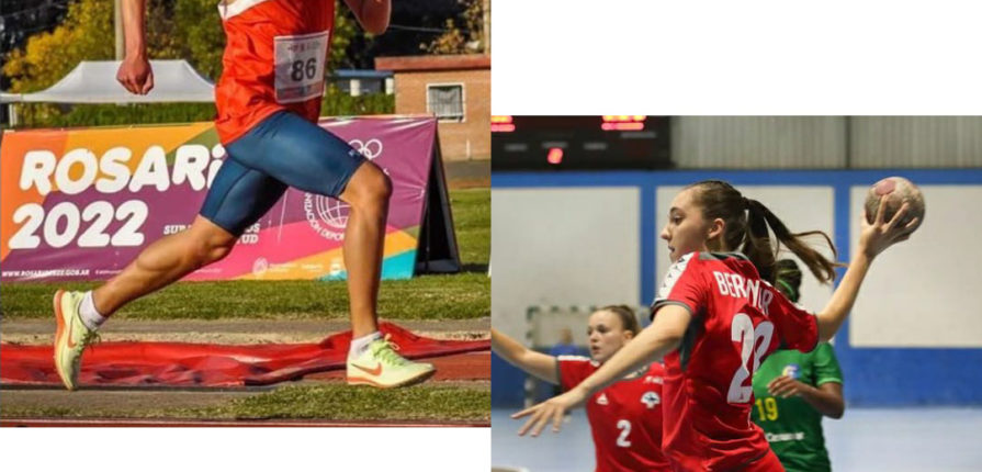 Ignacia Berlinger (II B) en el Handball junto a la selección nacional en el sudamericano clasificatorio en Brasil y Gastón González (III C) en el Atletismo en los Juegos Sudamericanos de Argentina.