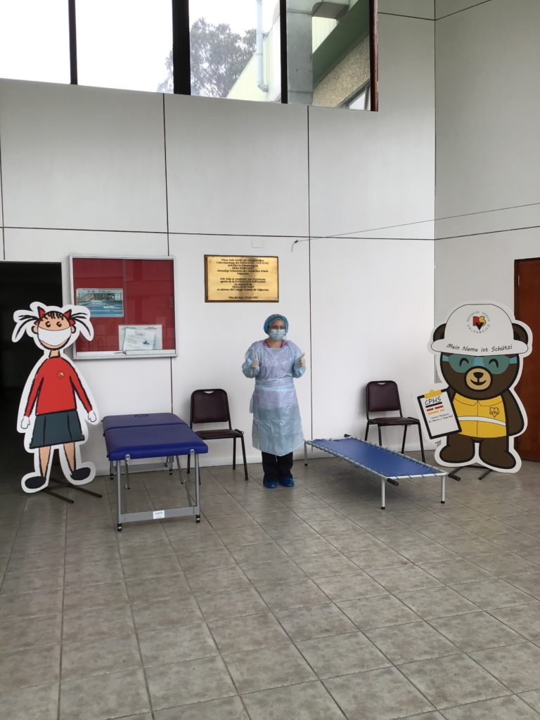 Der Isolationsraum neben der Aula wurde eingerichtet, nachdem dieses Jahr wieder Präsenzunterricht stattfinden konnte. Alle Mitglieder der Schulgemeinschaft, die Covid-19-Symptome aufweisen müssen sich dorthin wenden. In diesem Bereich gibt es 2 Behandlungsräume, sowie den Raum der Krankenpflege. Verschiedene medizinische Kontrollen können dort stattfinden, sowie Patienteninformation erfragt werden, z.B. zur Verfolgbarkeit. Mehr Informationen auf Spanisch in unserem Rückkehrprotokoll, Seite 23.
