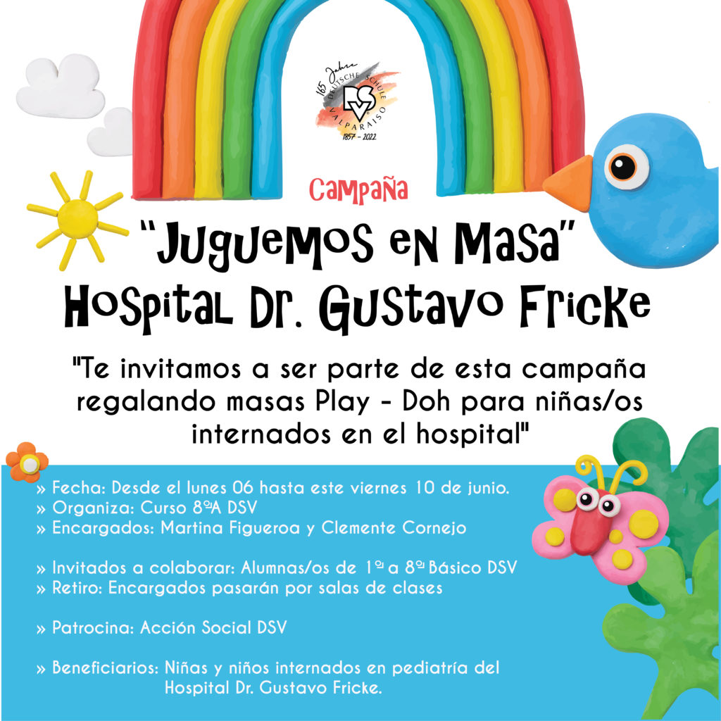 Gracias al compromiso y entusiasmo de las alumnas y los alumnos del 8°A, nuestra Enseñanza Básica se sumó a la campaña «Juguemos en masa», donando masas Play-Doh a niñas y niños que son pacientes del servicio médico quirúrgico pediátrico del Hospital Dr. Gustavo Fricke.