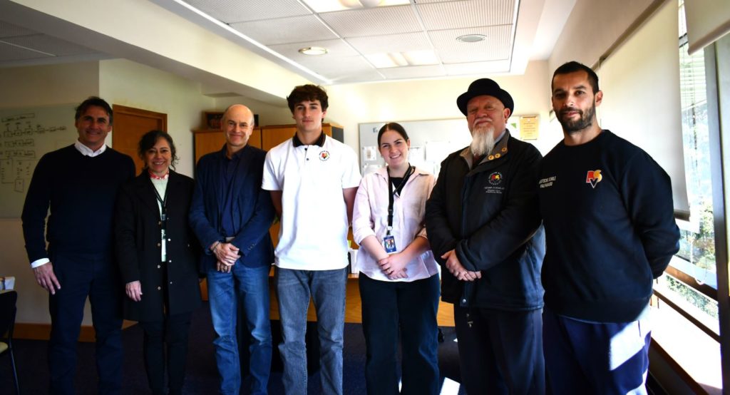 De izq. a der: Ulises Ríos (padre de Tristán); Yasna Cataldo (Vicerrectora y encargada UTP); Martin Gellert (Rector); Tristán Ríos; Lilian Neumann (profesora jefe del I°C); César Cornejo (Director de Enseñanza Media); Pablo Ugarte (Jefe Departamento Sport)
