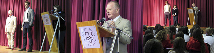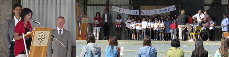 El señor Czoske, quien inició sus funciones el pasado miércoles 15 de marzo, fue recibido por los alumnos de la Enseñanza Básica en una actividad realizada en la Multicancha del colegio, ocasión en la que el coro del ciclo le dedicó un pequeño saludo musical. En tanto, los alumnos de Enseñanza Media le dieron la Bienvenida en el marco del acto de “cambio de mando” del Centro de Alumnos.