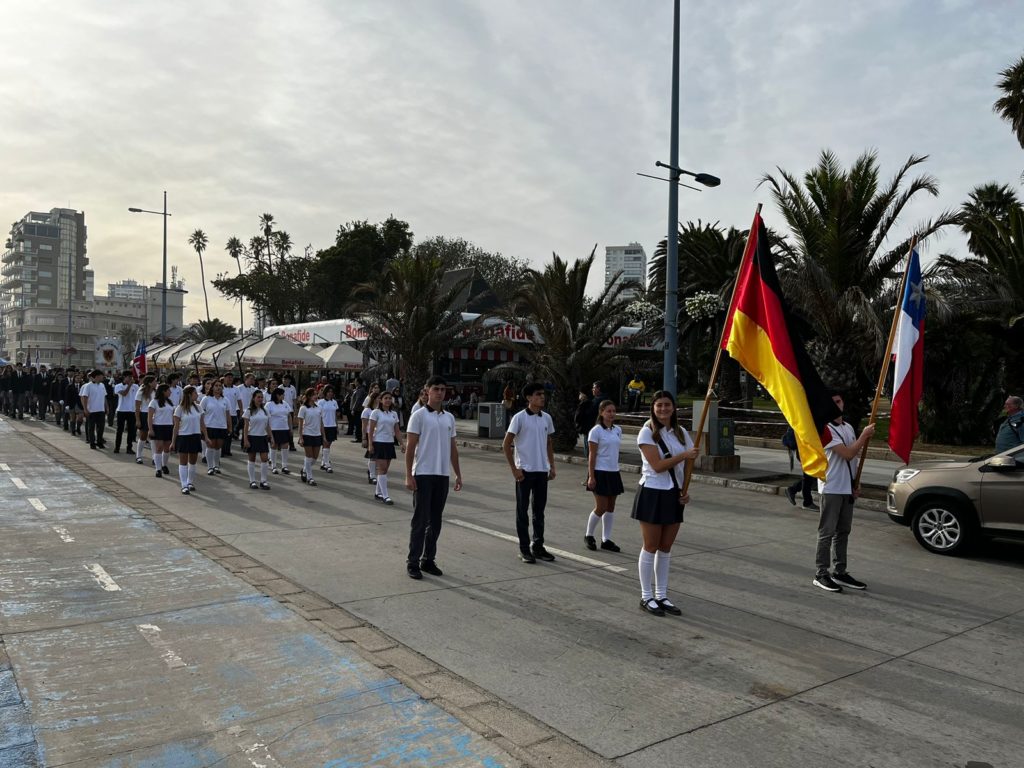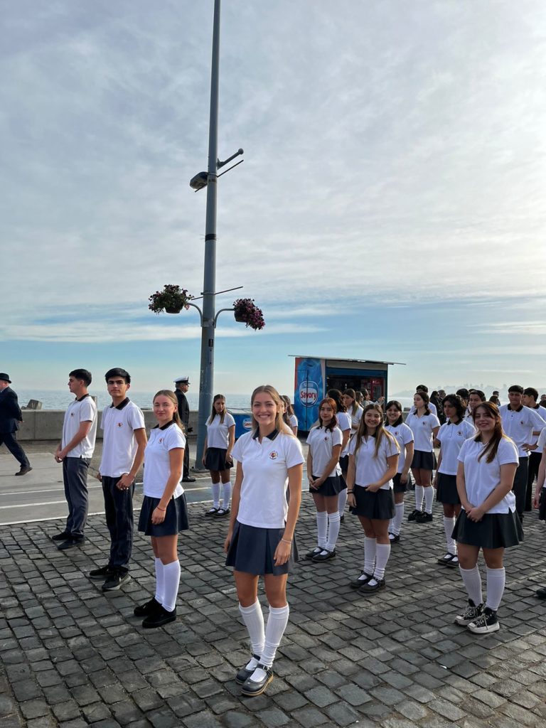 El tradicional desfile de distintos colegios de la región se realiza en la Avenida Perú de Viña del Mar, frente al monumento de los Héroes de Iquique. Nuestros alumnos fueron acompañados por el Director de la Enseñanza Media, César Cornejo y el profesor Diego Neira.