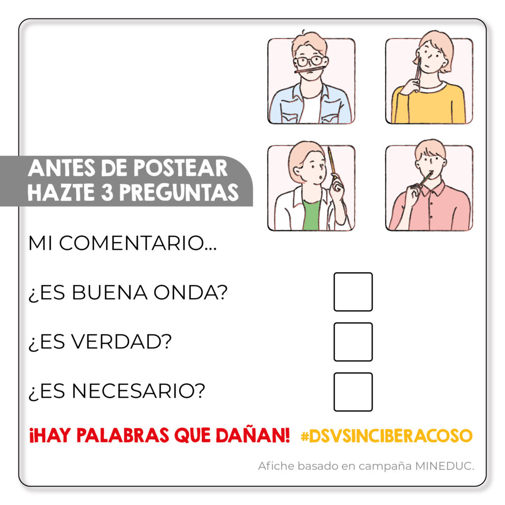 Como Equipo de Convivencia Escolar nos hacemos parte de esta iniciativa facilitando el desarrollo de actividades e instancias de reflexión para prevenir el ciberbullying. Reconocemos que esta es una tarea compleja que requiere un enfoque integral y la colaboración de todos los miembros de la comunidad educativa.