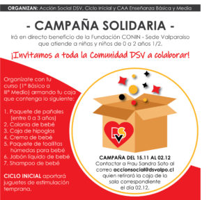 Junto con saludar, y esperando se encuentren muy bien, comparto con ustedes actividad solidaria que vamos a realizar en conjunto con los centros de alumnos de básica y media, más la invitación realizada al ciclo inicial para que nos colaboren con juguetes de estimulación temprana que irá en directo beneficio de la Fundación CONIN- Sede Valparaíso que atiende a niños y niñas de 0 a 2 años 1/2.