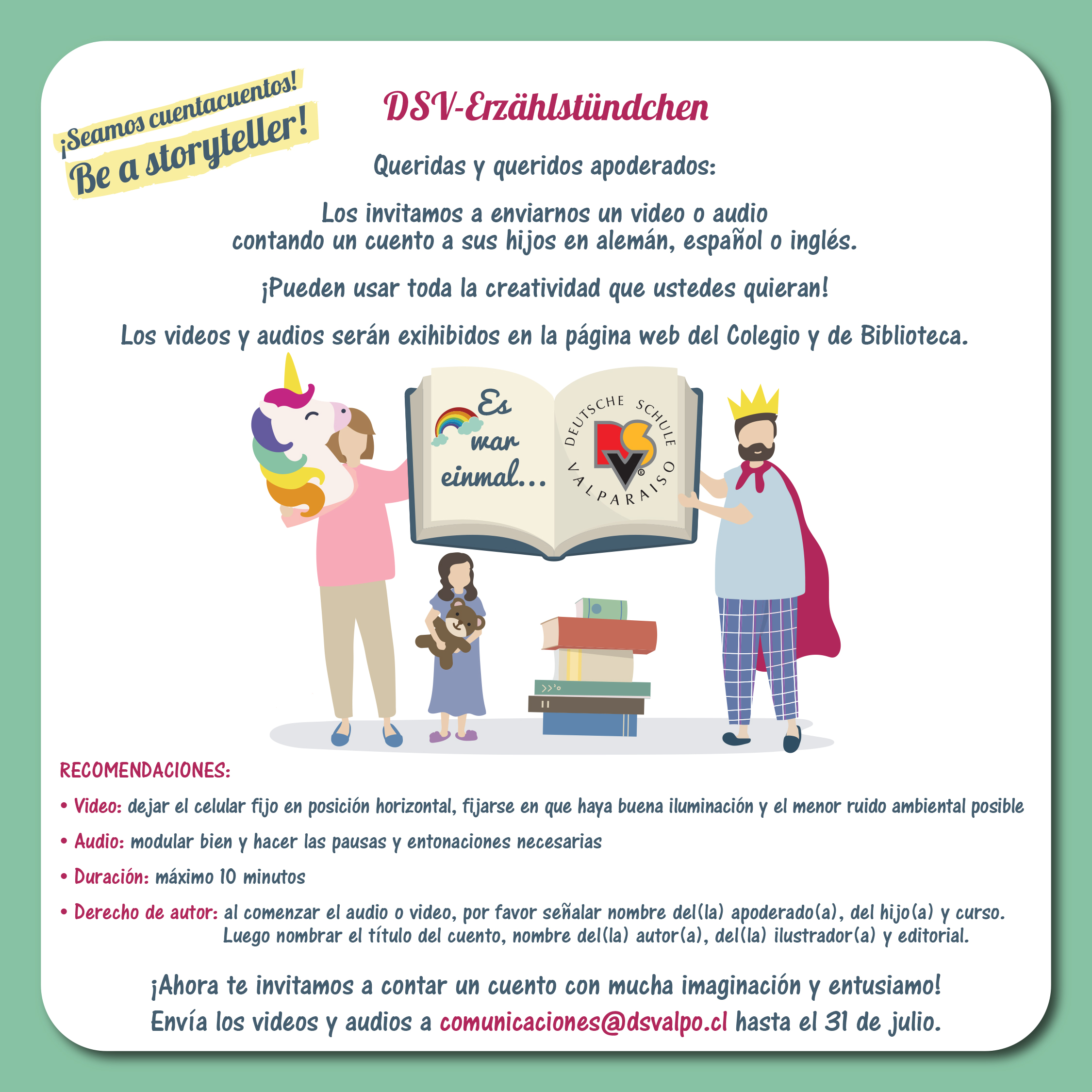 Wir danken den Eltern herzlich für ihre Beteiligung an der Initiative „Seamos cuentacuentos – DSV Erzählstündchen- Be a storyteller“. Sie haben uns ihre Videos geschickt, in denen sie Geschichten und Märchen für die Familien der Schulgemeinschaft vorlesen.