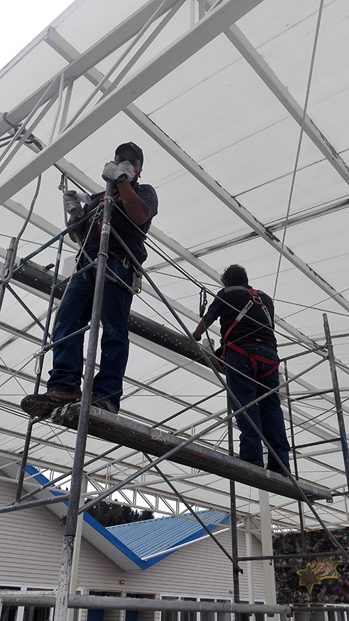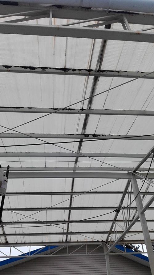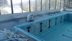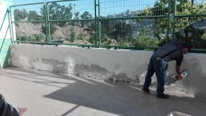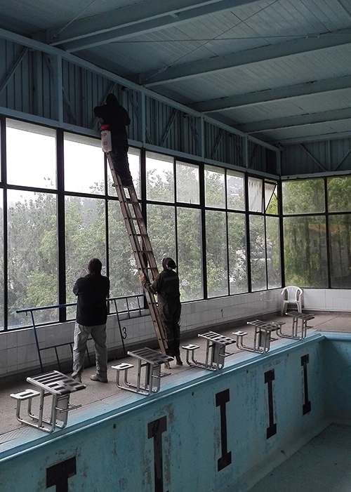 • Reparatur des Daches des Schwimmbads. Das Eisen wurde repariert und neue Strukturen wurden eingerichtet. Das Dach wurde mit Antioxidationsmittel gesäubert. Danach wurde es mit Epoxidfarbe angestrichen.