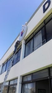 • Installation des neuen Logos der Schule an der Fassade des Hauptgebäudes.