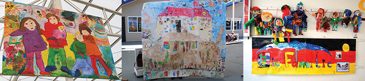 En la entrada del sector Kindergarten nos reciben figuras construidas con elementos en desuso que fueron reciclados por los niños, acompañados por el letrero “Familie 160”. Esta “antesala” nos invita a entrar al patio central, donde se ubica la exposición “La familia en el Colegio Alemán de Valparaíso” y que muestra 6 grandes retratos de familias realizados por los niños de Kindergarten quienes plasmaron la idea de familia desde su lúdica perspectiva.